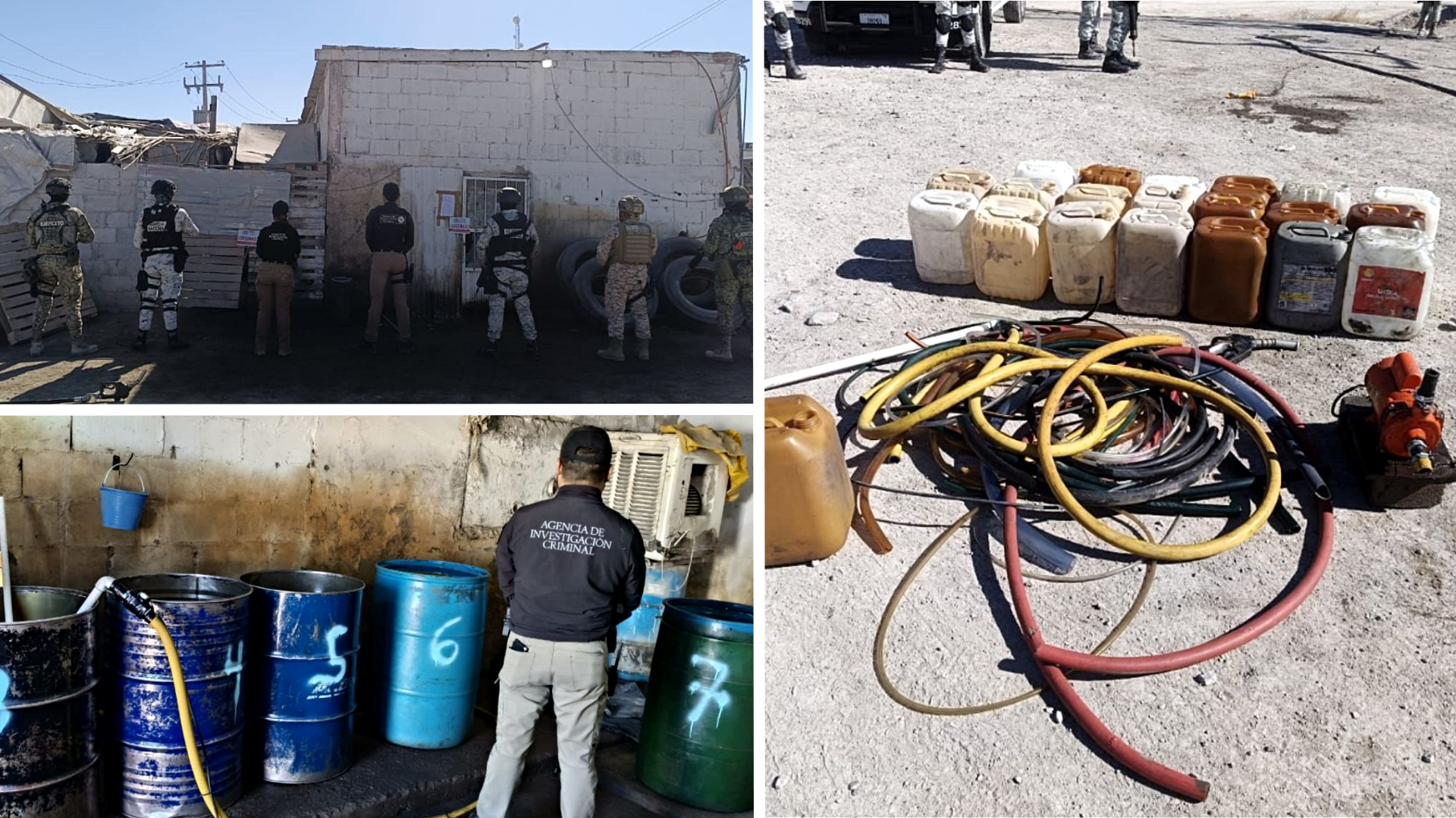 Asimismo, fue asegurado un contenedor cuadrado con capacidad de mil litros, el cual se encontraba lleno en su totalidad. Durante el cateo también se localizaron dos pistolas despachadoras conectadas a una bomba, misma que fue inhabilitada en el sitio, además de una pistola despachadora adicional, 22 mangueras y 22 bidones vacíos con capacidad de 20 litros cada uno. El inmueble quedó a disposición del agente del Ministerio Público Federal, quien continuará con las investigaciones correspondientes para deslindar responsabilidades y proceder conforme a derecho.