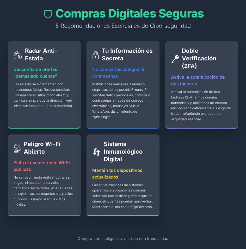 Otras recomendaciones incluyen evitar el uso de redes Wi-Fi públicas para realizar transacciones financieras o compras en línea, así como mantener actualizados los dispositivos electrónicos. Las actualizaciones de sistemas y aplicaciones corrigen vulnerabilidades que pueden ser explotadas por ciberdelincuentes, especialmente en temporadas de alta actividad digital.