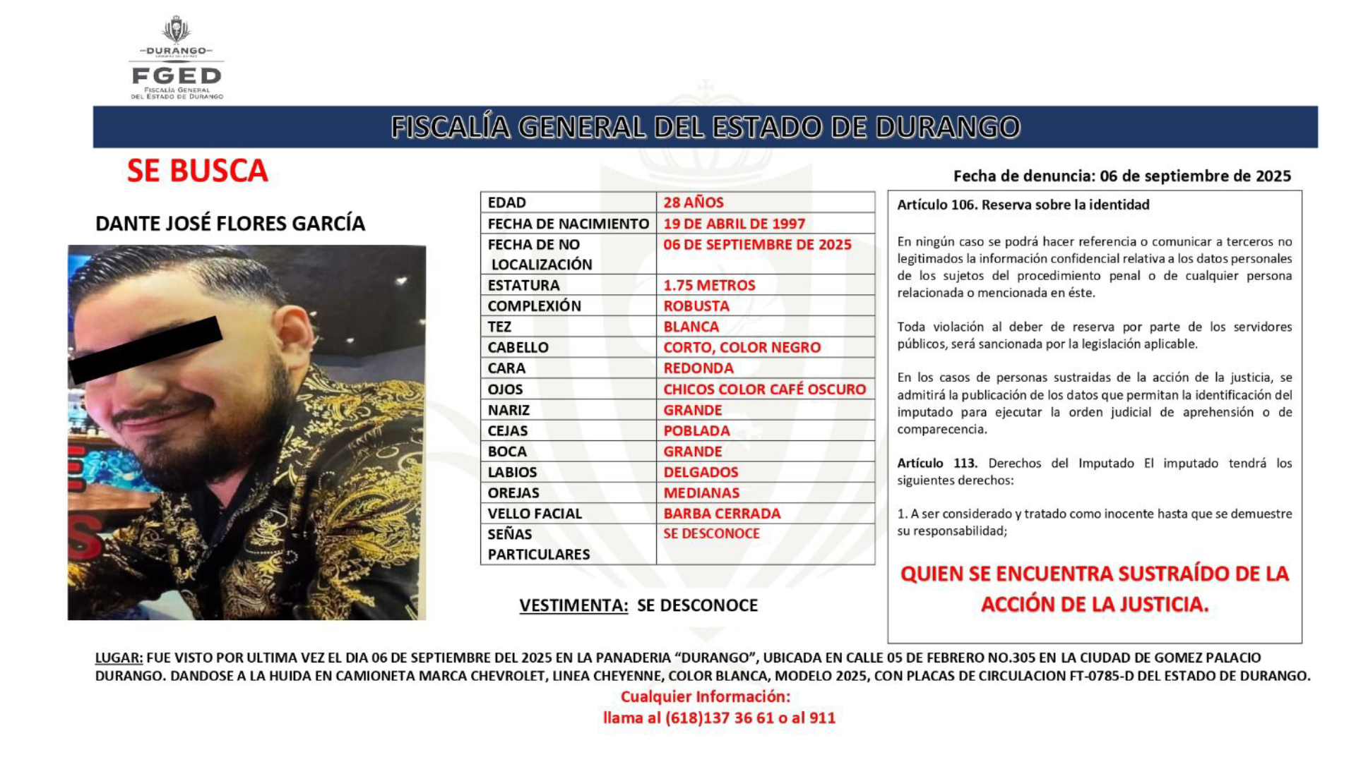 Comarca Lagunera / Gómez Palacio, Dgo.– La Fiscalía General del Estado de Durango (FGED) lanzó una ficha de búsqueda para localizar a Dante “N”, señalado como presunto responsable del asesinato de un menor de 14 años, ocurrido el pasado 6 de septiembre en una panadería del centro de esta ciudad.
