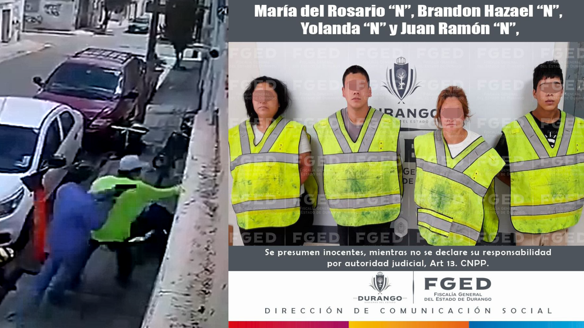 Durango, Dgo.- La Fiscalía General del Estado de Durango (FGED) informó la detención de cuatro personas presuntamente implicadas en el homicidio de dos hombres y las lesiones de un tercero, tras un ataque armado ocurrido el pasado 15 de septiembre en la calle Castañeda, en pleno Centro de la capital.