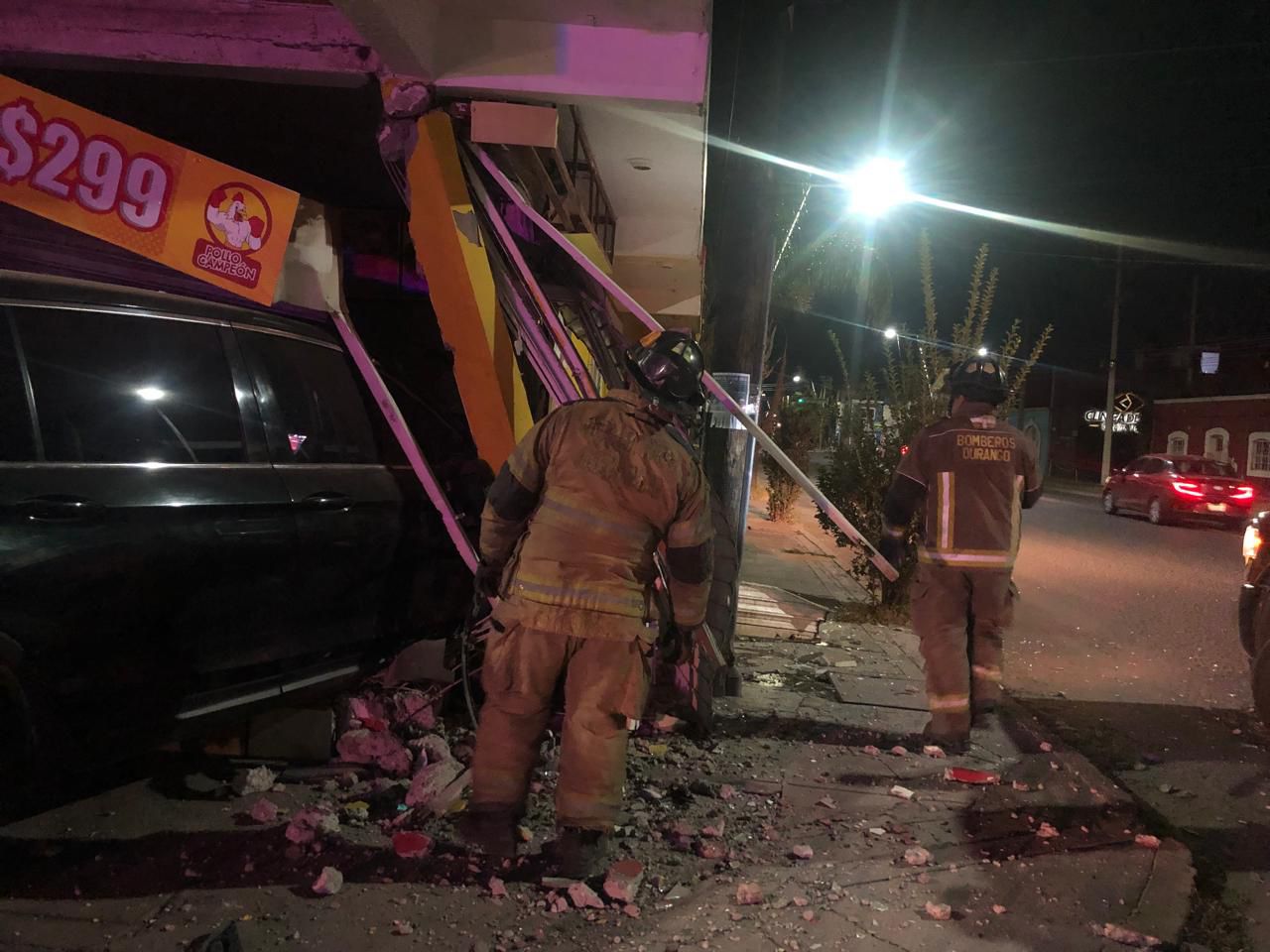 Durango, Dgo.- Durante la madrugada de este lunes, elementos del Cuerpo de Bomberos de Durango atendieron un accidente vehicular registrado sobre la avenida Cuauhtémoc, entre las calles Profesor Fernando Carrillo e Isauro Venzor, en la colonia Ciénega, donde una camioneta Honda Pilot de modelo reciente ingresó parcialmente al interior de un local de comida.