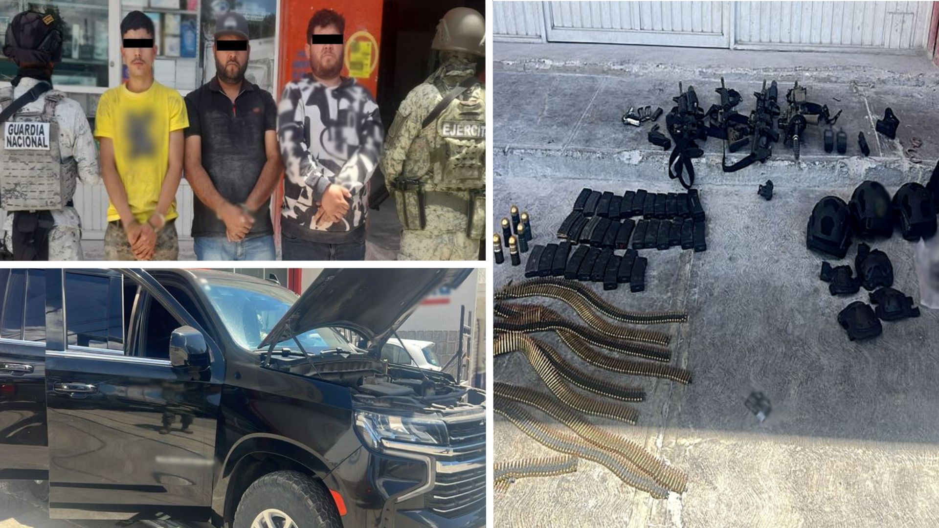 Guardia Nacional y Ejército Mexicano decomisaron armas largas, granadas y chalecos tácticos; serán presentados ante un juez federal.