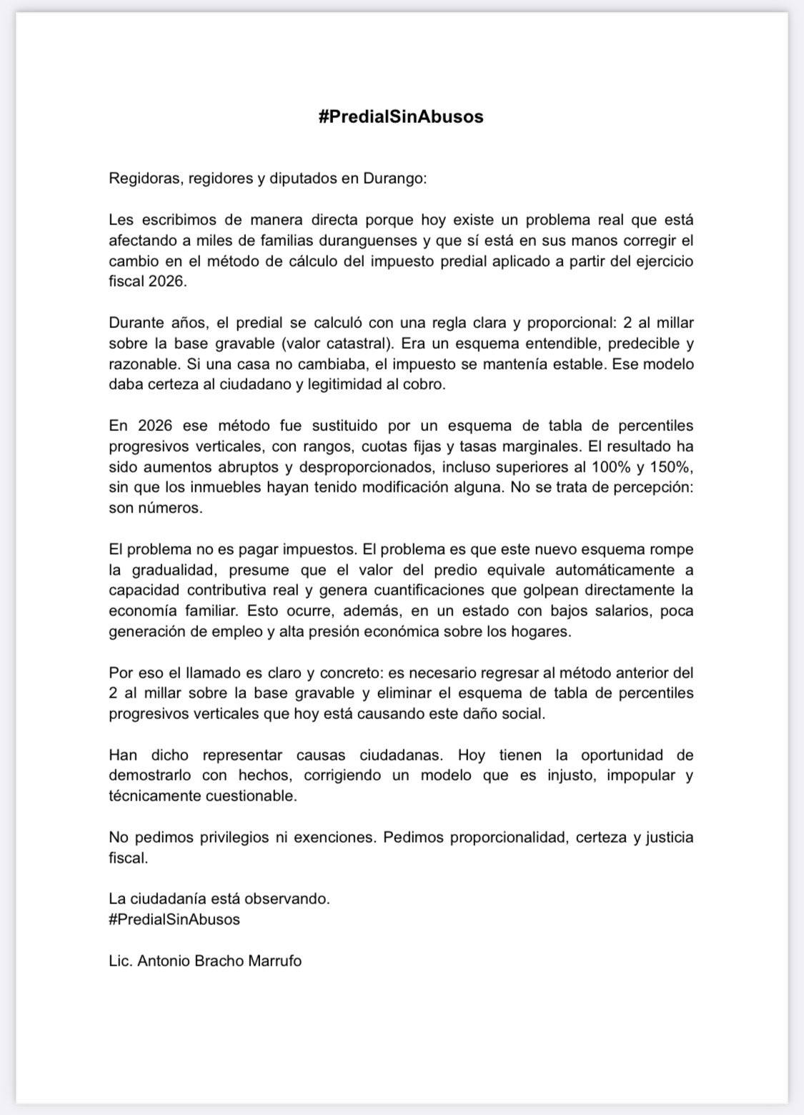 Durango, Dgo.- La inconformidad por el incremento al impuesto predial en Durango continúa creciendo y ya comenzó a traducirse en pronunciamientos públicos y acciones de organización ciudadana. A la protesta de contribuyentes se sumó el exdirector de Seguridad Pública, Antonio Bracho Marrufo, quien lanzó un exhorto directo a regidores y diputados locales para revertir el nuevo método de cálculo aplicado a partir del ejercicio fiscal 2026.