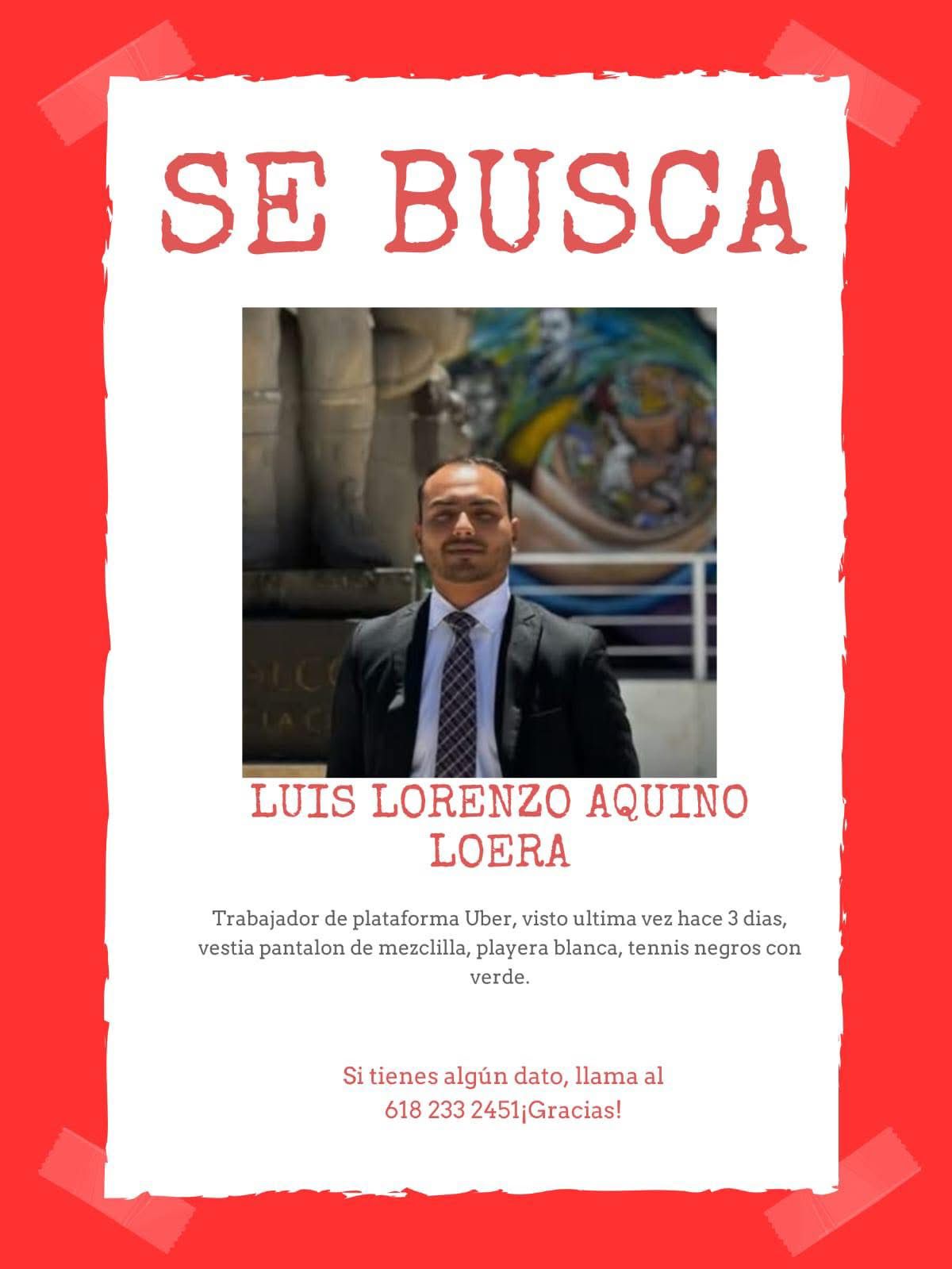 Durango, Dgo.— La familia de Luis Lorenzo Aquino Loera, joven conductor de la plataforma Uber, vive momentos de profunda incertidumbre desde hace tres días, cuando perdieron todo contacto con él luego de que saliera a trabajar.