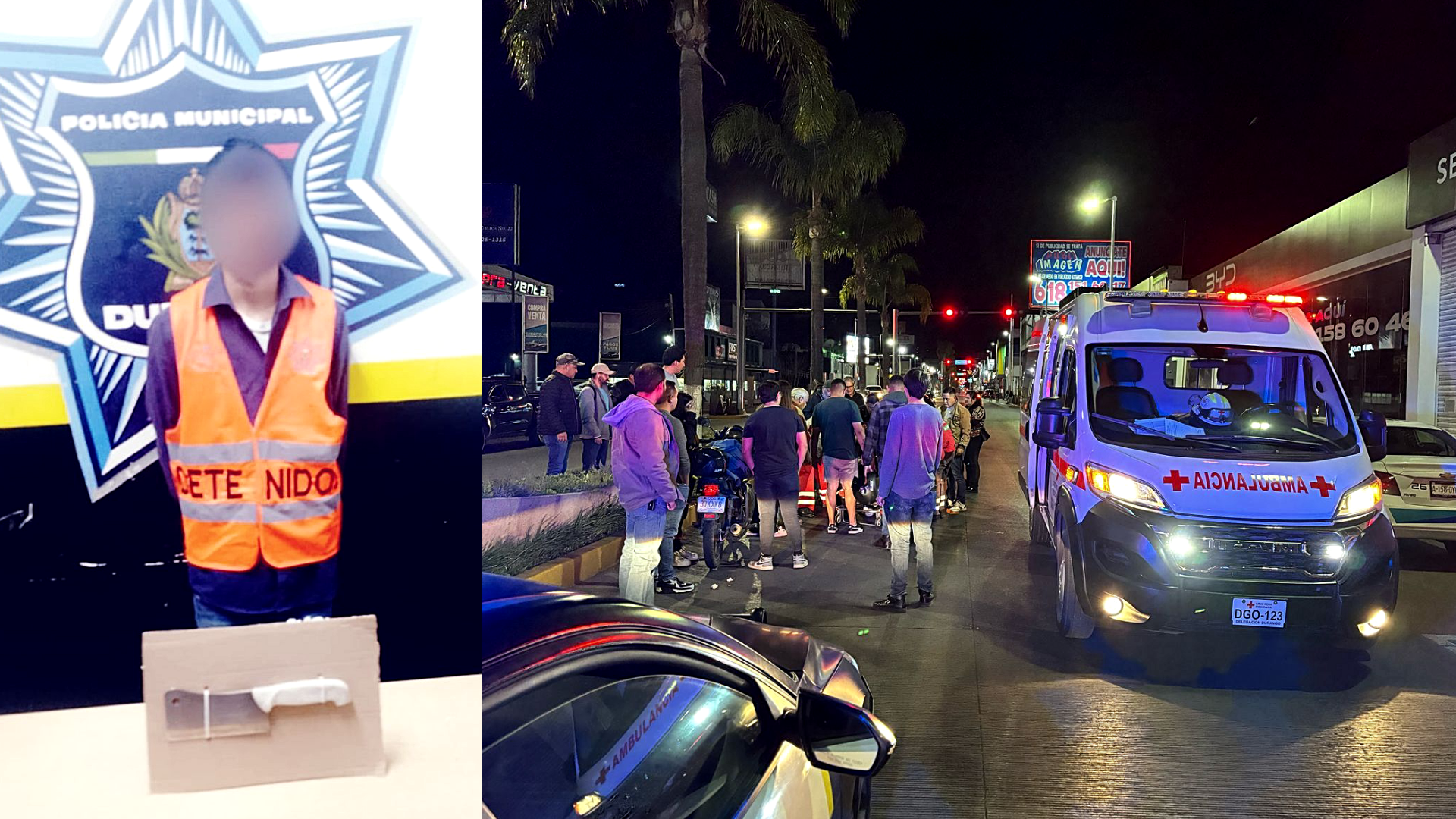 Durango, Dgo.- Elementos de la Policía Municipal detuvieron a Juan de Dios “N”, de 25 años de edad, quien presuntamente agredió con un arma blanca a una joven en plena vía pública, causándole diversas lesiones en el rostro y las manos.