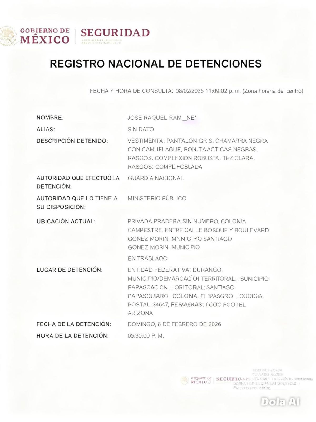Durango, Dgo.- De acuerdo con información del Registro Nacional de Detenciones (RND), José Raquel “N.” fue detenido la tarde del domingo 8 de febrero de 2026 en el municipio de Santiago Papasquiaro, Durango.