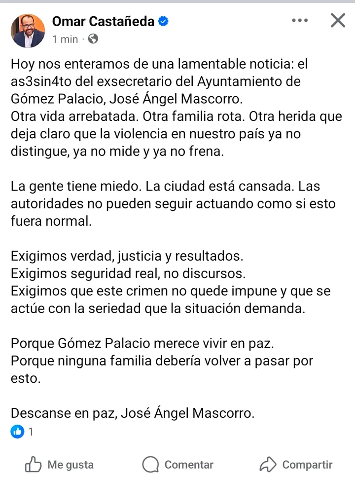 Castañeda, exdiputado federal por Gómez Palacio, subrayó que la violencia continúa cobrando vidas sin distinción y pidió que el crimen no quede impune. A su mensaje se sumó el Partido Revolucionario Institucional (PRI) de Gómez Palacio, que emitió sus condolencias a la familia del exfuncionario.