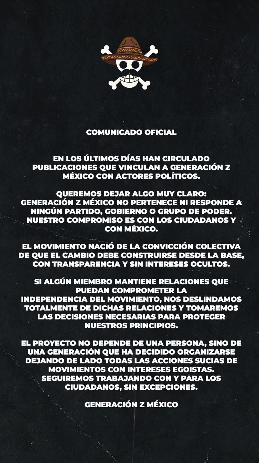 El deslinde ocurre en un contexto de creciente tensión nacional en torno a la movilización de la Generación Z, luego de que la presidenta Claudia Sheinbaum Pardo señalara que detrás de la convocatoria nacional podrían existir actores de derecha y cuentas falsas vinculadas a inteligencia artificial.