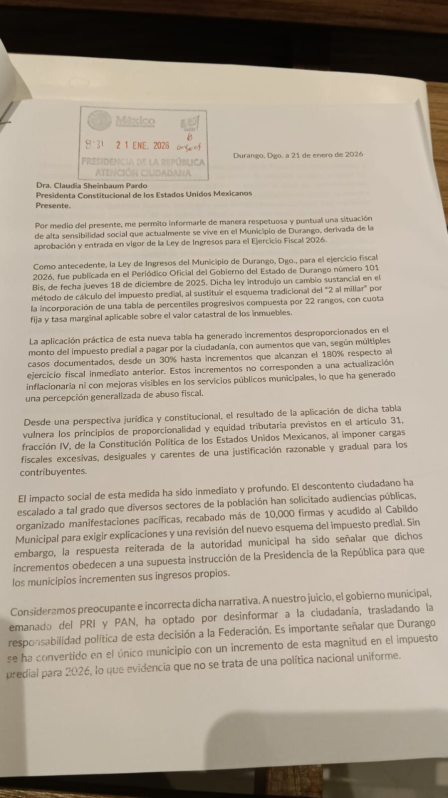 El documento fue dirigido a la presidenta constitucional de los Estados Unidos Mexicanos, Claudia Sheinbaum Pardo, y expone los efectos del nuevo esquema de cálculo del impuesto predial establecido en la Ley de Ingresos municipal, publicada el 18 de diciembre de 2025 en el Periódico Oficial del Gobierno del Estado de Durango.