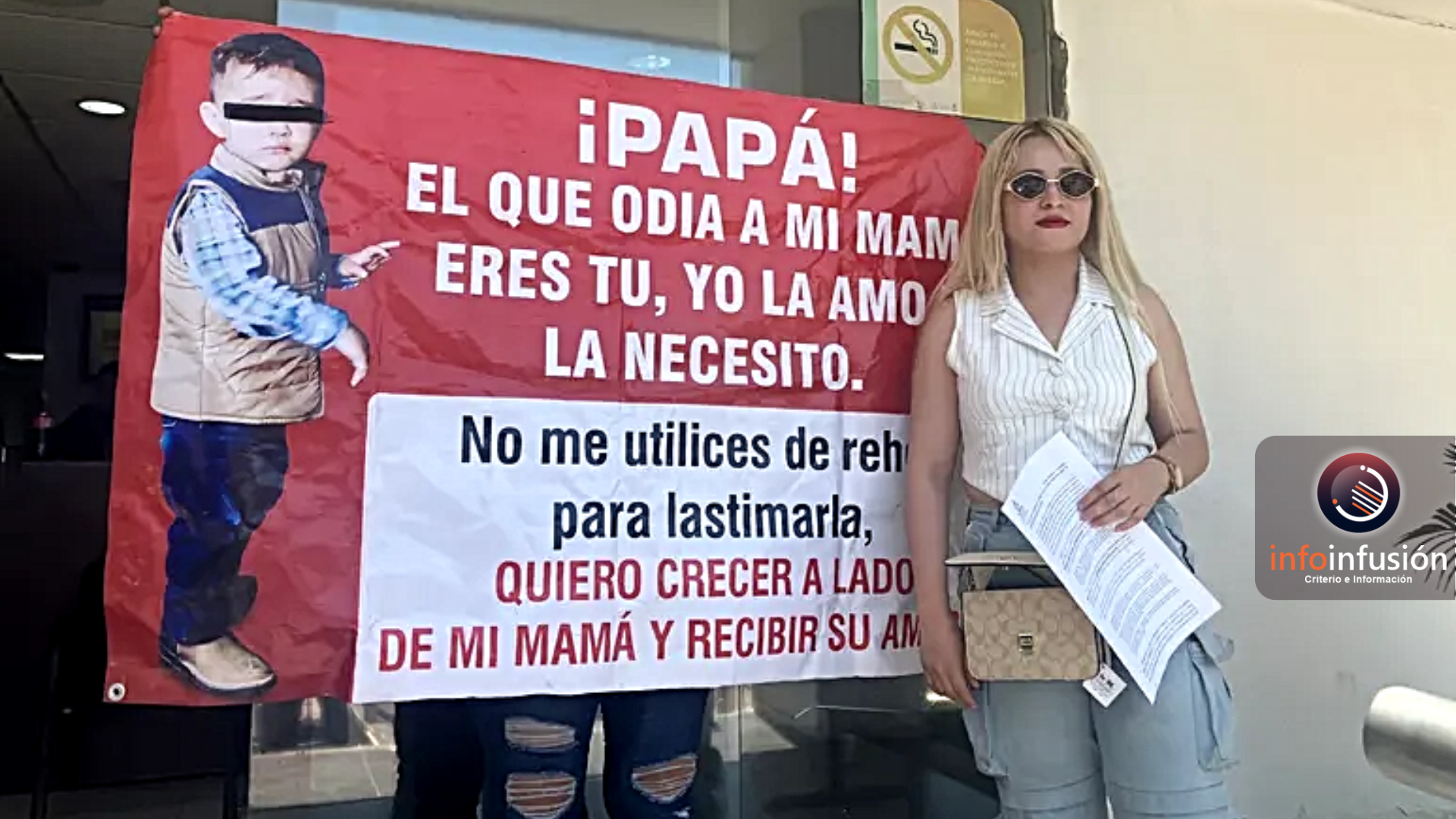 Acompañada únicamente por una pancarta con la imagen de su hijo mayor y una frase dirigida al padre del menor, Yamilet se plantó en el acceso principal del inmueble judicial para denunciar irregularidades y omisiones por parte del juez responsable de su caso, quien —según afirma— ha favorecido a su agresor, permitiéndole incluso participar en audiencias por videollamada bajo el argumento reiterado de tener COVID-19.