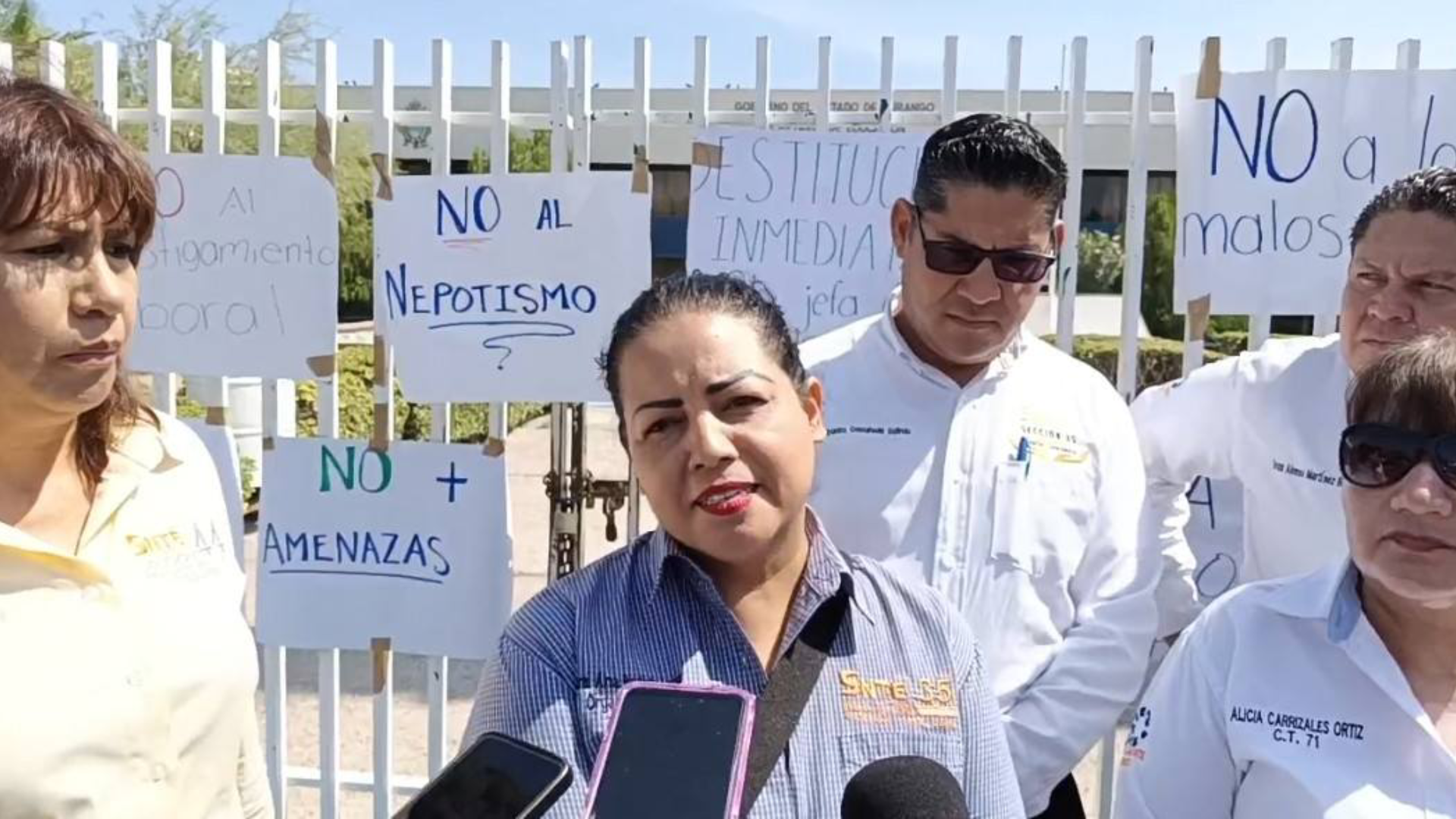 En la fachada del inmueble se colocaron diversas pancartas con consignas como “Destitución inmediata de la maestra Gloria”, “No más abuso de poder”, y “Respeto a la NOM-035”, en alusión a la norma que protege la salud mental y laboral de los trabajadores.