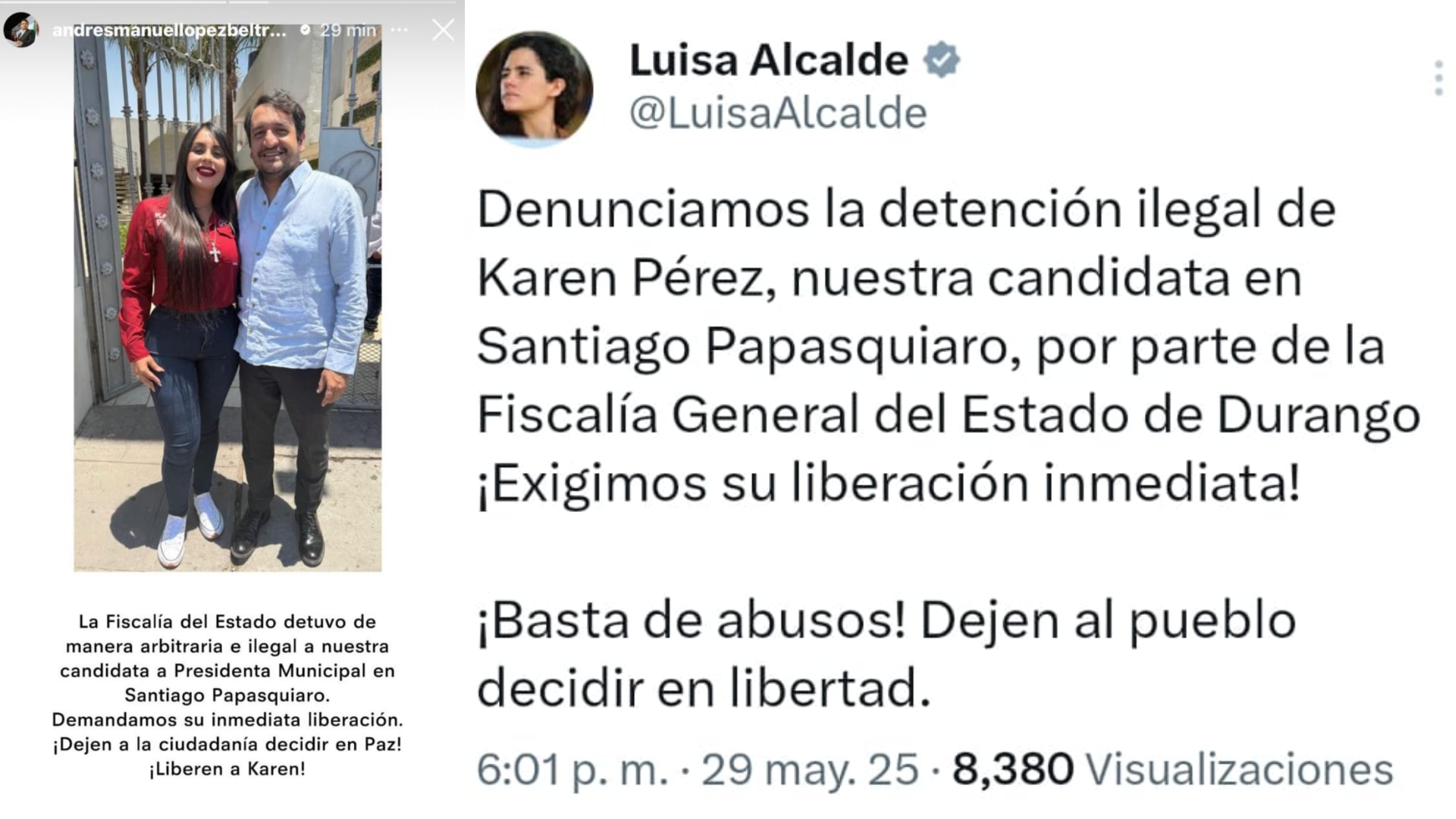 “Denunciamos la detención ilegal de Karen Pérez, nuestra candidata en Santiago Papasquiaro, por parte de la Fiscalía General del Estado de Durango. ¡Exigimos su liberación inmediata! ¡Basta de abusos! Dejen al pueblo decidir en libertad”.