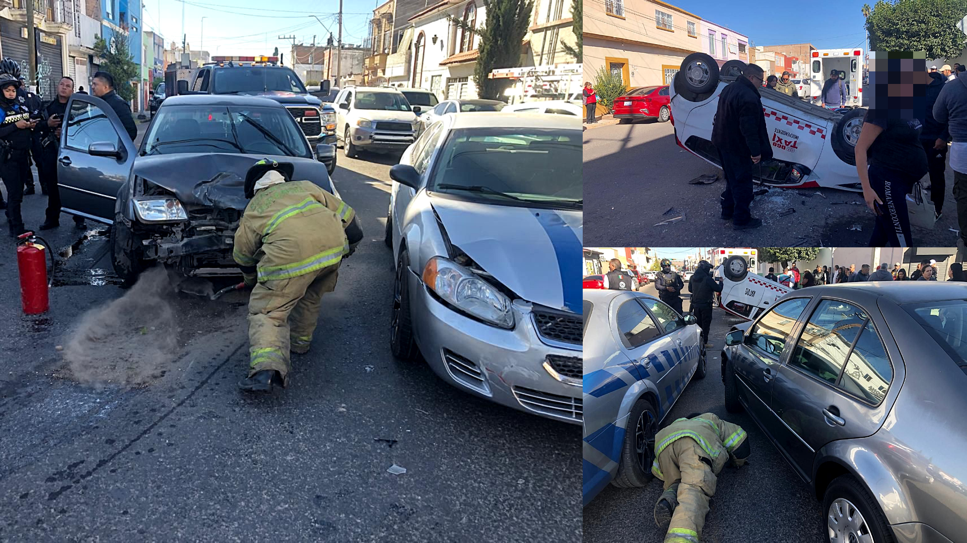 Durango,Dgo.- La Dirección Municipal de Protección Civil y Bomberos de Durango atendió este lunes un accidente vial en el cruce de Pino Suárez y Laureano Roncal, donde tres vehículos se vieron involucrados, entre ellos un taxi que terminó volcado tras el impacto.