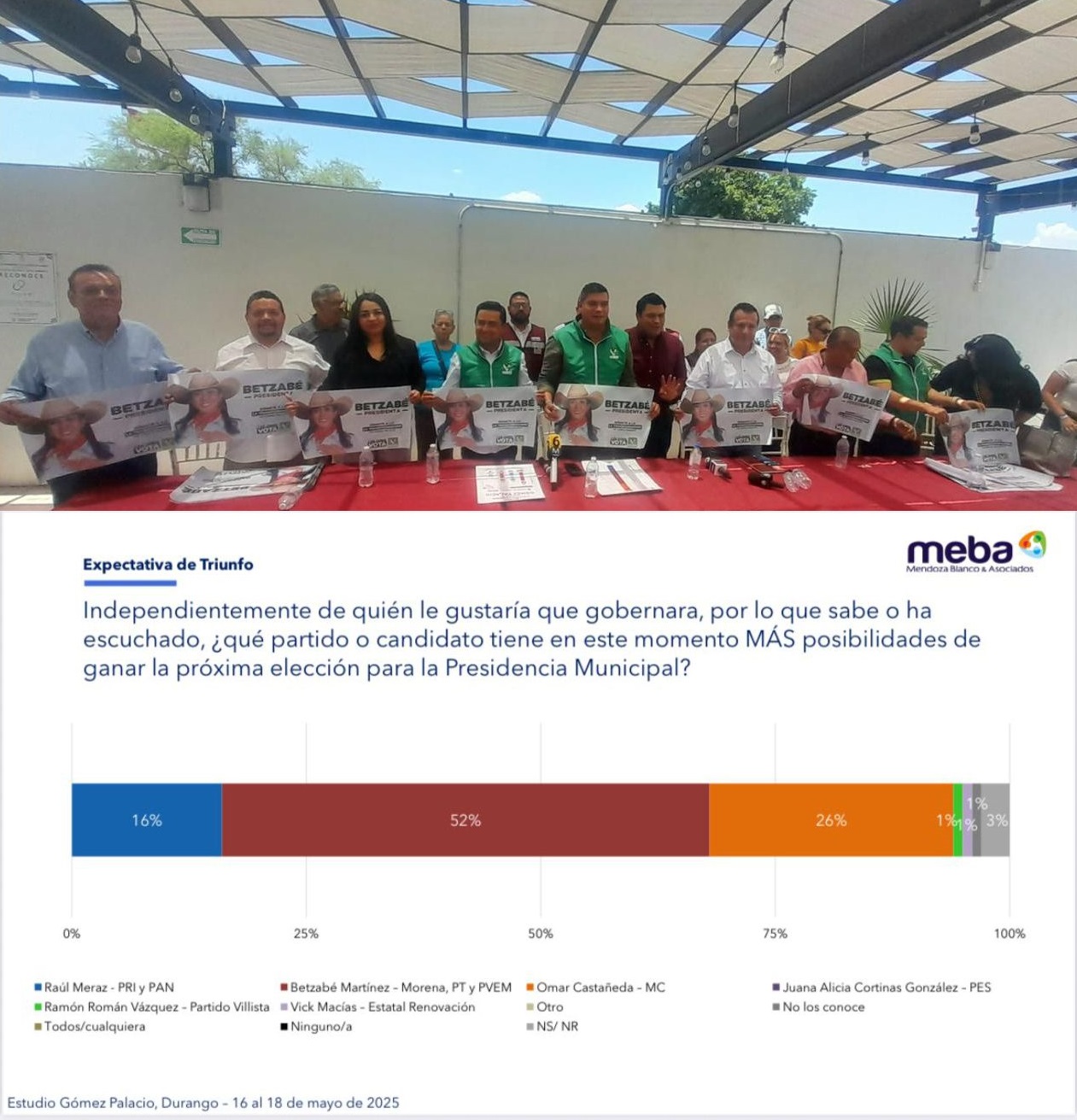 De acuerdo con otro estudio de opinión, de Mendoza Blanco y asociados, una de las casas encuestadoras más precisas y prestigiadas del país, Betzabe tiene el 52 por ciento en percepción de triunfo contra 26 por ciento de Movimiento Ciudadano y un 16 por ciento del PRI-PAN.