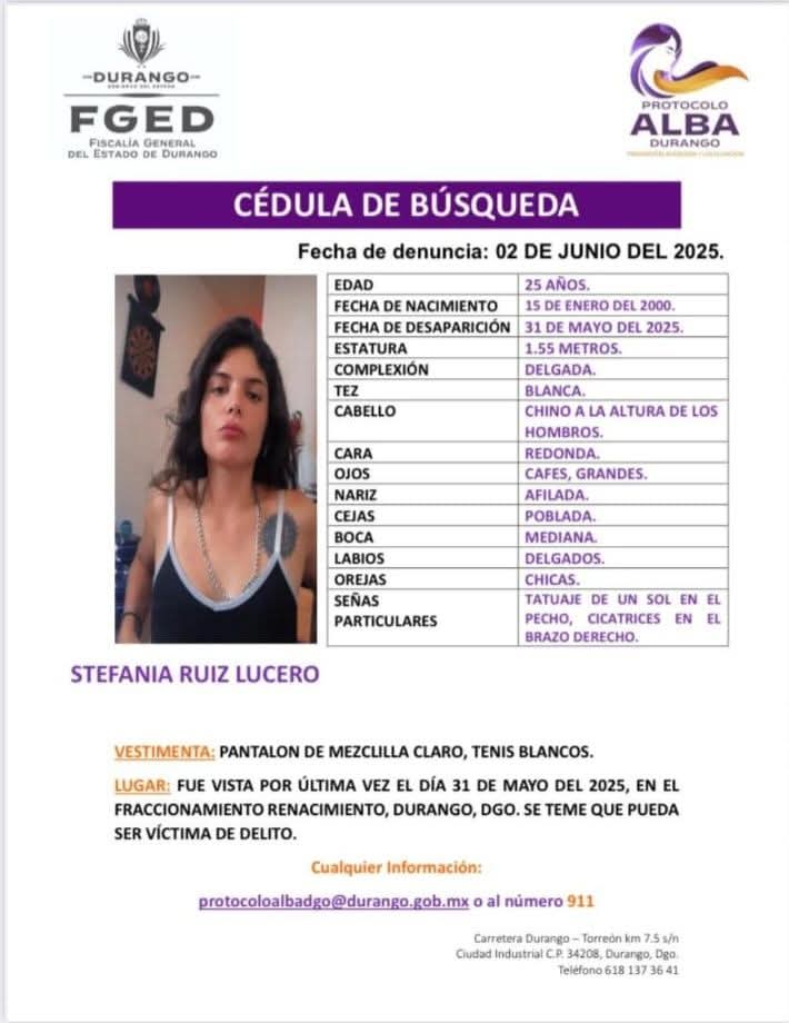 Durango, Dgo.- Autoridades y familiares solicitan el apoyo de la ciudadanía para localizar a Stefania Ruiz Lucero, joven de 25 años de edad, quien fue vista por última vez el pasado 31 de mayo en el fraccionamiento Renacimiento, ubicado en la ciudad de Durango.