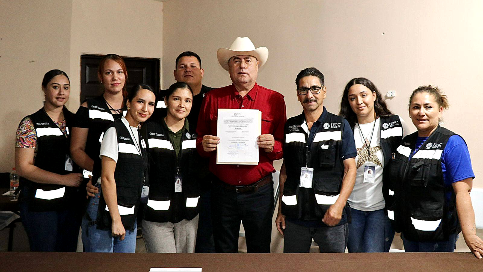 Tamazula, Dgo.- En un acto oficial realizado cerca de la medianoche, el candidato de Morena, Ricardo Ochoa Beltrán, recibió la constancia de mayoría que lo acredita como presidente municipal electo de Tamazula, lo que confirma su reelección para un nuevo periodo de gobierno.