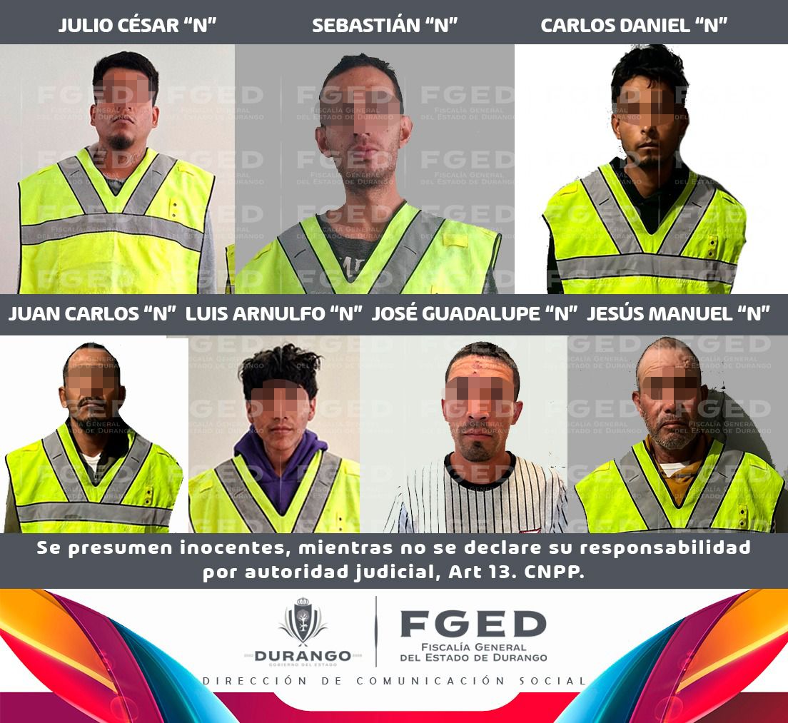 De acuerdo con la dependencia, los imputados —Sebastián “N”, Julio César “N”, Carlos Daniel “N”, Juan Carlos “N”, Jesús Manuel “N”, José Guadalupe “N” y Luis Arnulfo “N”— fueron detenidos en flagrancia los días 9, 11 y 12 de febrero en distintos puntos de los municipios de Durango y Gómez Palacio.